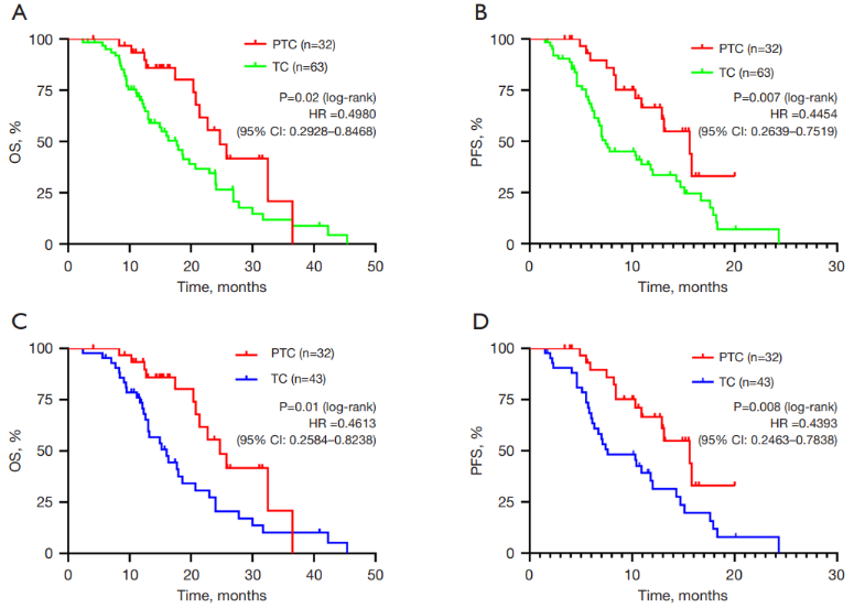 在PSM前,PTC组的中位OS为24.67个月,TC组为17.70个月;中位PFS分别为15.57个月和7.37个月。PSM后,PTC组的中位OS仍显著优于TC组(24.67个月vs.16.00个月,HR=0.4613,P=0.01),中位PFS也显著延长(15.57个月vs.7.57个月,HR=0.4393,P=0.008)(图2)。这表明,在一线治疗中加入PD-1抑制剂可显著改善HER2阳性胃癌患者的生存结局。