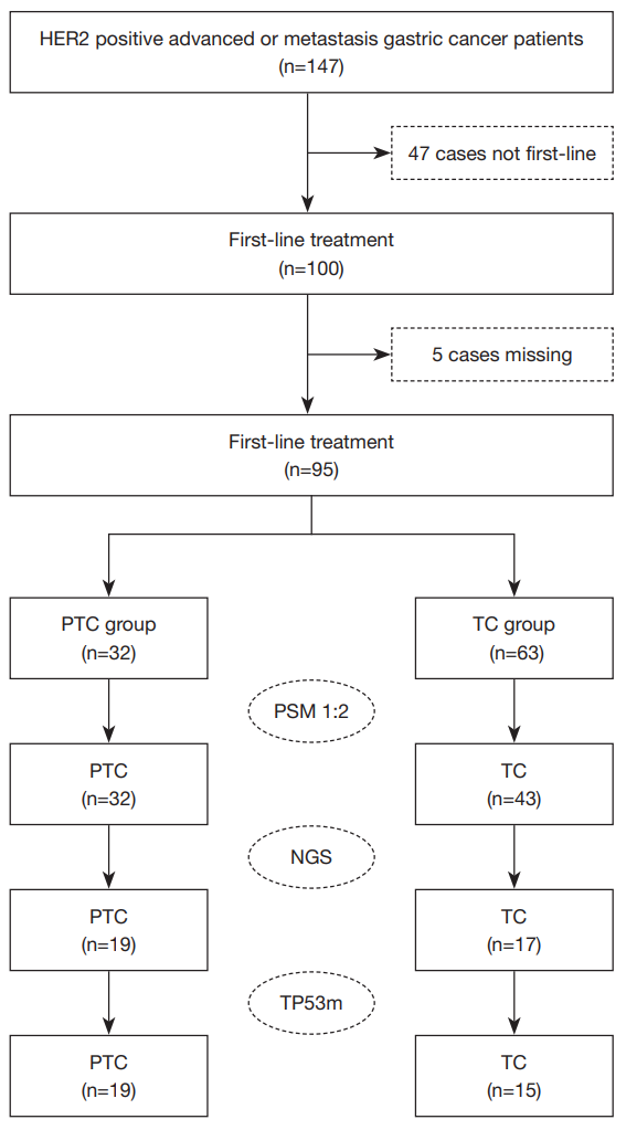 本研究回顾性纳入了2019年1月至2022年9月在复旦大学附属中山医院接受一线治疗的95例HER2阳性晚期或转移性胃腺癌患者。所有患者经组织学确认HER2阳性。患者被分为两组:PTC组(接受PD-1抑制剂+曲妥珠单抗+化疗,n=32)和TC组(接受曲妥珠单抗+化疗,n=63)。为减少混杂因素,研究采用倾向评分匹配(PSM)以1:2比例进行匹配,最终PTC组32例,TC组43例(图1)。研究的主要终点为总生存期(OS),即从治疗开始到患者死亡或末次随访的时间;次要终点为无进展生存期(PFS),即从治疗开始到疾病进展的时间。