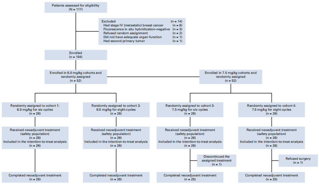 截至2024年9月24日,本研究104例受试者成功入组,6.0 mg/kg、六周期(队列1),6.0 mg/kg、八周期(队列2),7.5 mg/kg、六周期(队列3),7.5 mg/kg、八周期(队列4)各26例,各队列间HR状态、肿瘤分期和HER2免疫组化状态特征均保持平衡,102例顺利完成手术,其中队列3中1例患者因妇科手术中断治疗,队列4中1例患者拒绝手术。