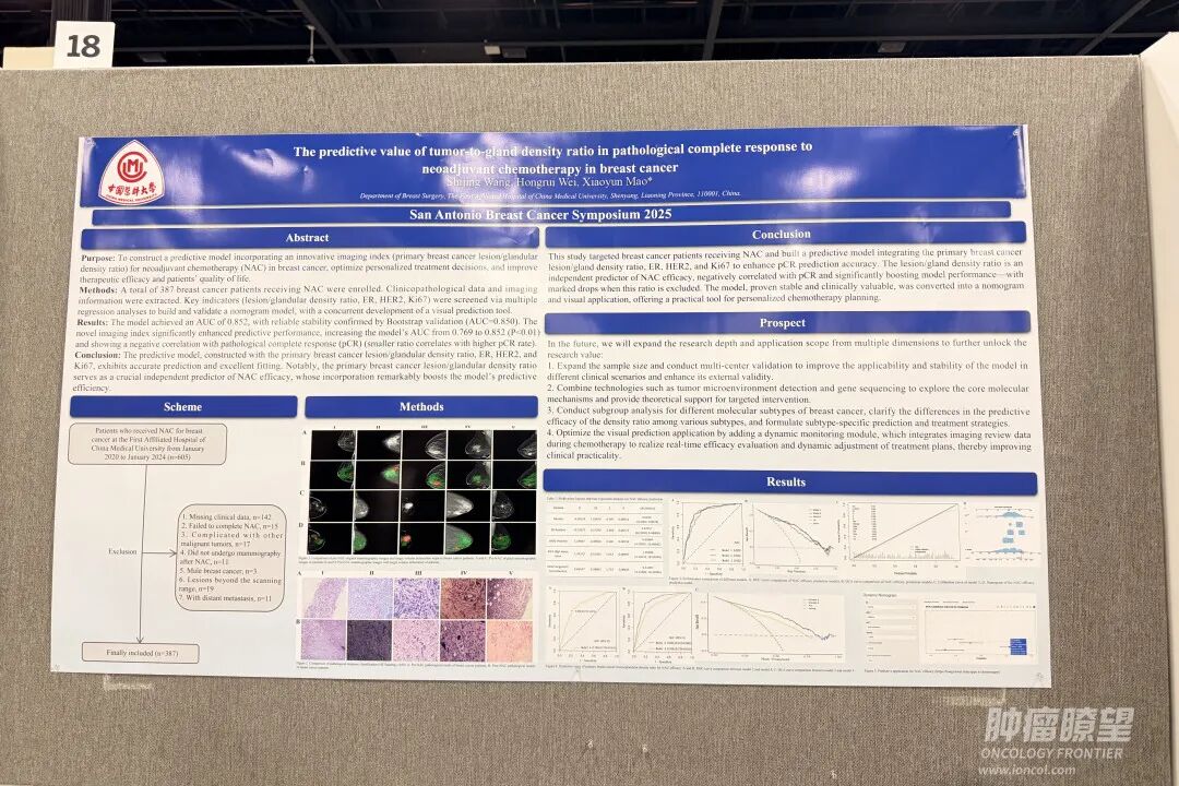 2025年第48届圣安东尼奥乳腺癌研讨会(San Antonio Breast Cancer Symposium,SABCS)于12月9日-12日在美国圣安东尼奥召开。中国医科大学附属第一医院毛晓韵教授领衔(主要研究者:汪时劲、魏宏芮)的一项回顾性研究在本会议上进行了壁报展示(摘要编号:P4-05-18),该研究开发并验证了一种基于术前乳腺钼靶影像特征和临床病理指标的列线图模型,用于预测乳腺癌患者新辅助化疗(Neoadjuvant chemotherapy,NAC)后的病理完全缓解(Pathological complete response,pCR)概率。该模型展现出优异的预测性能和校准能力,决策曲线分析表明其在较宽的阈值概率范围内具有显著的临床净获益。这一研究成果为乳腺癌患者NAC疗效的术前精准预测提供了有力工具,有助于指导个体化治疗决策。肿瘤瞭望特邀毛晓韵教授进行介绍,并邀请陆军军医大学大坪医院徐琰教授对该研究进行点评。
