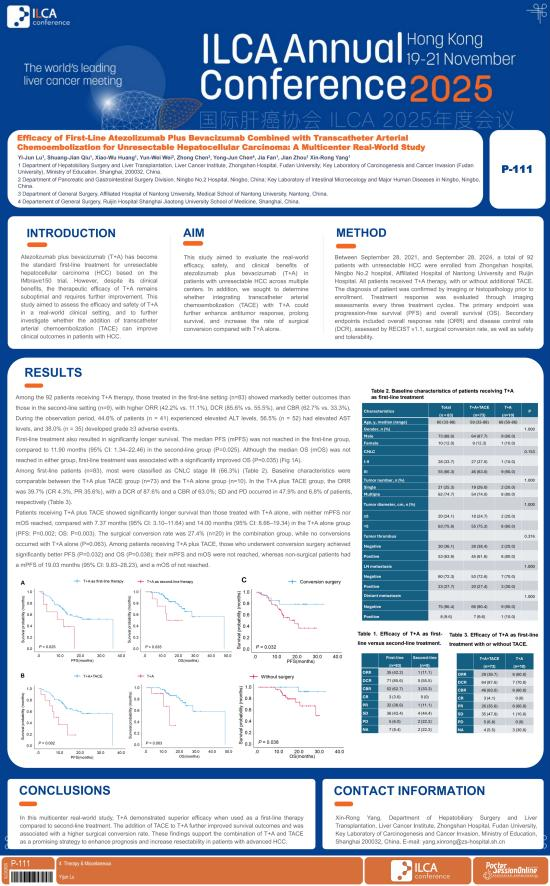 [1].Xinrong Yang,et al.Efficacy of First-Line Atezolizumab Plus Bevacizumab Combined with Transcatheter Arterial Chemoembolization for Unresectable Hepatocellular Carcinoma:A Multicenter Real-World Study.2025 ILCA Abstract#P-111