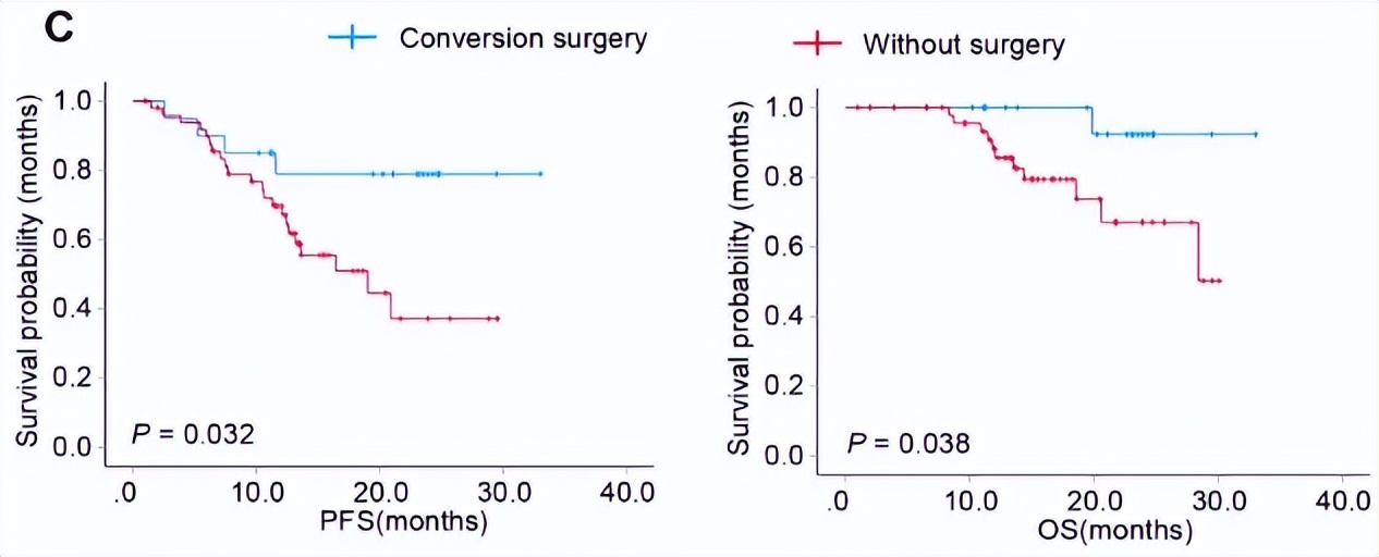 一线联合治疗组接受或不接受转化手术治疗的PFS和OS分析