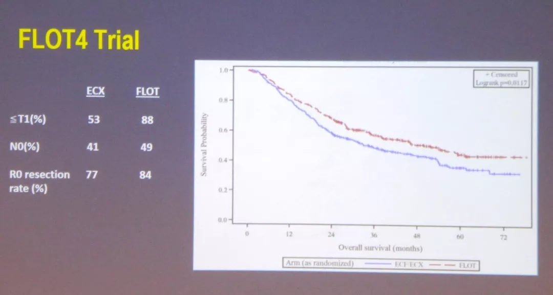 外科手术是目前唯一可能治愈胃癌的方法,但对于进展期胃癌,仅行单纯手术常常伴随着术后高复发风险,患者的预后往往较差。理论上,术前的新辅助治疗可缩小肿瘤灶使得肿瘤降期、提高R0切除率、控制微小转移灶、减少术后的复发转移,以延长患者生存结局。Leong教授回顾了多个经典的胃癌新辅助治疗临床试验,自从2006年MAGIC研究报道了术前术后各3疗程ECF联合手术治疗对比单纯手术可显著提高患者的无复发生存和总生存后,随后的包括FNCLCC/FFCD研究、ST03研究和FLOT4研究也陆续证实及优化新辅助化疗在进展期胃癌中的疗效。Leong教授指出FLOT4研究的无论在R0切除、病理缓解率以及生存结局,均显示出FLOT4方案的优势,可为临床的决策提供更好的选择,当然FLOT4较高的不良事件也值得我们进一步优化方案。