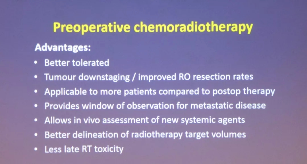 Leong教授小结了这4项研究中辅助治疗的依从性,发现术前化疗的依从性均达到90%以上,而进行胃癌手术后的依从性仅在50%左右,这跟胃癌术后的消化道重建从而导致的胃肠功能下降、高营养不良发生率有关。Leong教授回顾了两项胃癌术后辅助放化疗研究(INT0116和CRITICS)后,指出术前新辅助放化疗的优势:更好的耐受性、肿瘤降期从而提高R0切除率、提供观察远处转移的时间窗以及体外药敏实验评估等优势。