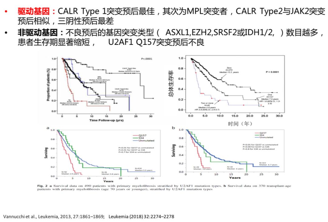 在三个重要的驱动基因突变中,CALR Type 1突变预后最佳,其次为MPL突变,CALR Type2与JAK2突变预后相似,三阴性预后最差。非驱动基因同样可影响PMF预后。随着不良预后的基因突变类型( ASXL1,EZH2,SRSF2或IDH1/2)数目增多,患者生存期显著缩短,U2AF1 Q157突变通常提示预后不良。研究证实,该预后积分系统对患者的预后效应高于IPSS 系统。