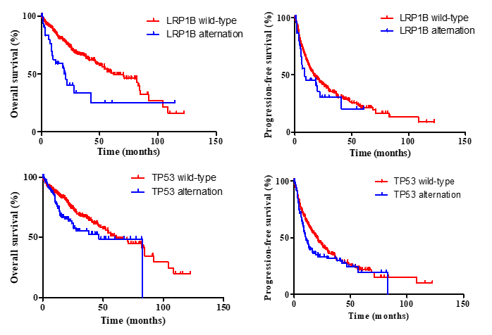 此外,还对TCGA cohort患者进行了预后分析。LRP1B突变的患者,OS显著缩短(OS中位值,20.9对61.7个月;HR,2.22;P=0.0012),无进展生存率(PFS)尽管未表现出统计学意义,但可见明细下降趋势(中位值8.7 vs 16.6 months; HR, 1.28; P=0.2839)。TP53突变亦是影响OS的独立危险因素(HR 1.58,P=0.0109)和PFS(HR 1.59,P=0.0027)。