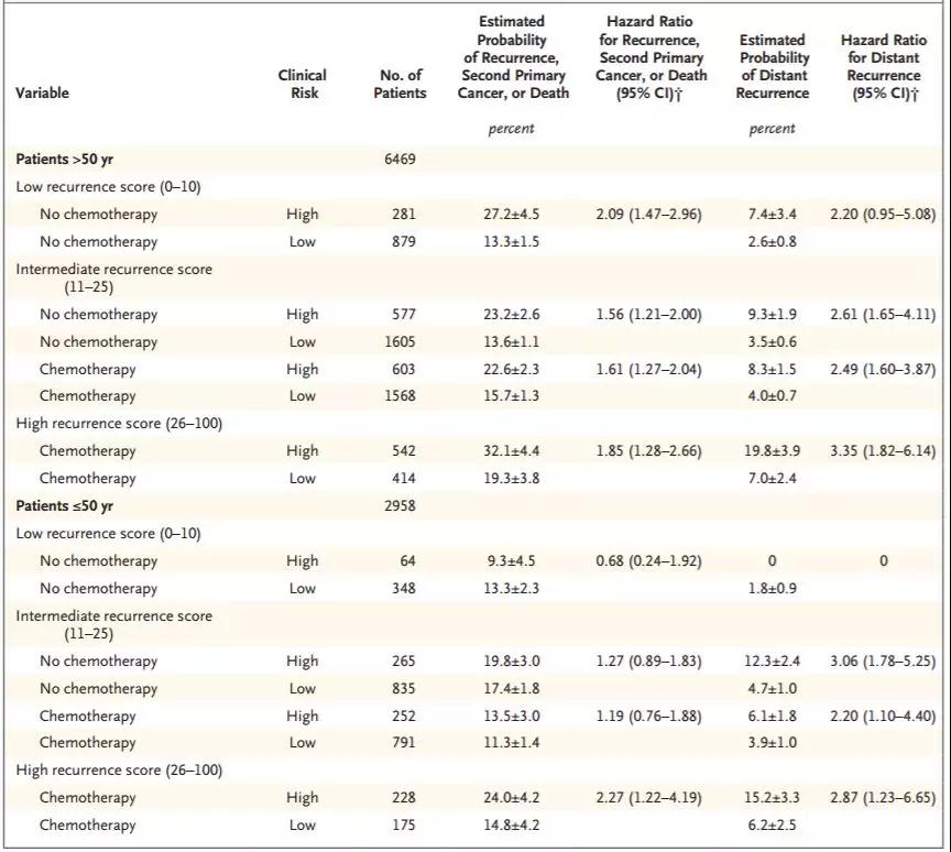 研究者在6496例随机分配至化疗联合内分泌组和单用内分泌组的中危患者中进行了进一步研究,分析临床风险评估能否提示化疗获益。在整体人群中,临床风险高危组与低危组相比,化疗联合内分泌组和内分泌组的预后无显著差异。同样地,根据年龄分层后,在年龄>50岁组和年龄≤50岁组中,临床风险评估也不能预测化疗获益。在年龄≤50岁且RS 16-25岁患者中,化疗联合内分泌治疗有预后更佳的趋势,但这种趋势在临床高危组和临床低危组中均可观察到。