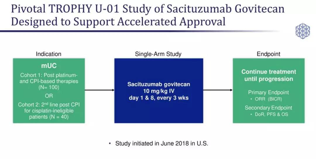 方法:TROPHY-U-01(NCT03547973)是一项全球开放性、Ⅱ期研究,旨在评估在转移性尿路上皮癌患者中SG的治疗疗效。用药方案为10mg/kg,d1和d8给药,21天为一个周期。患者ECOG评分0/1分。肌酐清除率≥30 mL/min。本次中期研究基于对队列1(铂类化疗或免疫治疗失败的晚期转移性膀胱癌患者)人群疗效评估的数据。队列1(N = 35) 采用Simon两阶段设计,其预先设定的无效终止规则为11% ORR。
