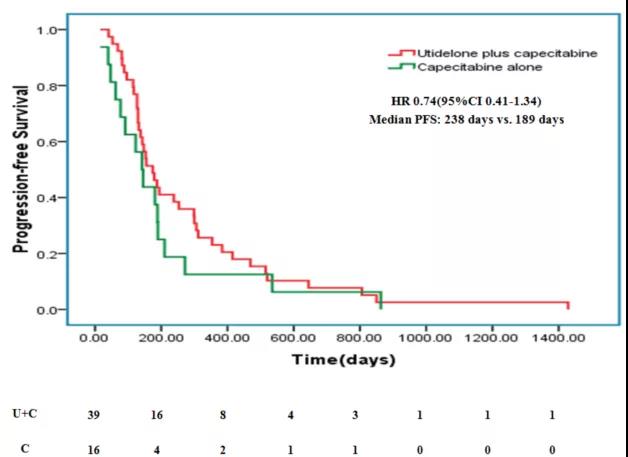 结果:基于独立影像学评估委员会的评估,优替德隆联合组的中位无进展生存期(PFS)为238天(7.8月),而卡培他滨单药组为189天(6.2月)(HR 0.74,95%CI 0.41~1.34;P=0.263)。亚组分析的结果同总体PFS结果保持一致。