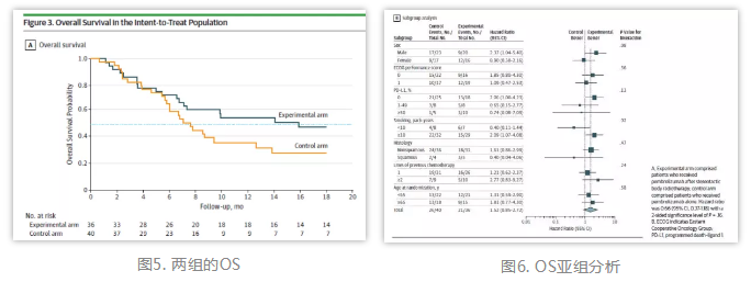 实验组和对照组的PFS分别为6.6个月(95%CI: 4.0-14.6个月)和1.9个月(95%CI: 1.7-6.9个月),但差异无统计学意义(HR=0.71; 95% CI: 0.42-1.18; P=0.19)(图3)。亚组分析发现,PD-L1表达阴性患者PFS获益更加明显(HR=0.49; 95% CI: 0.26-0.94, P=0.03),而PD-L1表达阳性患者未观察到这一获益(HR=1.14; 95% CI: 0.45-2.89; P=0.79)(图4)。