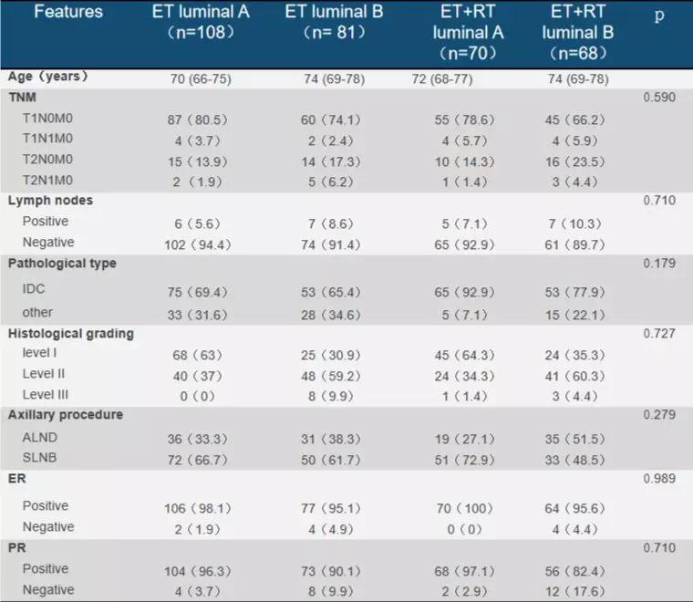 研究共纳入患者327例,其中ET组(单内分泌治疗)分为Luminal A型(108例)和Luminal B型(81例)两个亚组;ET+RT组(放疗加内分泌治疗)分为Luminal A型(70例)和Luminal B型(68例)两个亚组。
