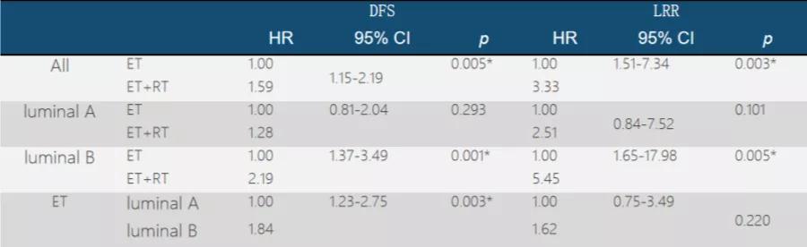 ET组和ET+RT组的5年LRR有显著差异(HR=3.33,95%CI 1.51-7.34;P=0.003)。在luminal A型中,ET组和ET+RT组的5年LRR没有显著差异(P=0.101)。在luminal B型中,ET组和ET+RT组之间的5年LRR有显著差异(HR=5.45,95%CI 1.65-17.98;P=0.005)。在ET组中,luminal A型和luminal B型之间的LRR没有显著差异(P=0.220)。