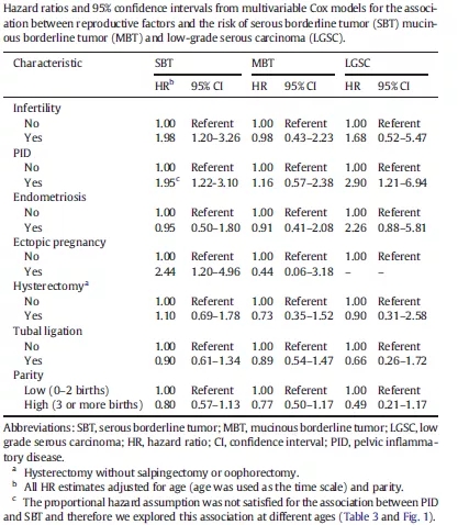 L.M.Stewart, C.J.R Stewart, K.Spilsbury, et al. Association between pelvic inflammatory disease ,infertility,ectopic pregnancy and development of ovarian serous borderline tumor,mucinous borderline tumor and low-grade serous carcinoma.Gynecologic Oncology, https://doi.org/10.1016/j.ygyno.2020.01.027