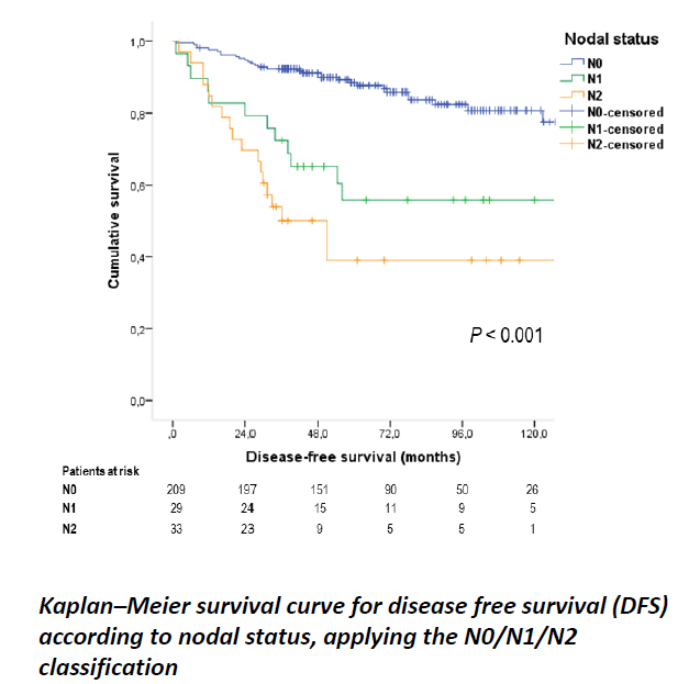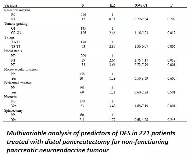 今年ENETS的一项研究评估了非功能性胰腺神经内分泌瘤(NF-PNETs)术后转移性淋巴结数量对无病生存(DFS)的影响,并确定合适淋巴结分期的最低检查淋巴结(LN)数量。该研究回顾性分析了4个欧洲中心的NF-PNETs,将淋巴结转移数分为N1(1-3阳性)和N2(4阳性),结果发现272例患者中,N0、N1和N2患者3年DFS分别为92%、72%和50% (p<0.0001)。在多变量分析中,DFS的预测因子为组织学分级(p=0.019)、T分期(p=0.006)、存在坏死 (p=0.001)和N1 (p=0.018)或N2 (p=0.001)。与转移性淋巴结数较高概率相关的因素有组织学分级、切缘状态、神经和微血管浸润以及检查的N数目。在12个淋巴结检查的患者中,淋巴结状态显著预测复发(p<0.001),小于12个淋巴结检查,则无意义(p=0.116)。提示手术切除的NF-PNETs中N转移的数目可以预测其复发。N0/N1/N2分类可以作为一个有效的复发预测模型应用于NF-PNETs。在接受远端胰腺切除(DP)治疗的NF-PNETs患者中,至少应收集12个N,以进行适当的分期(图4,5,6)[7]。