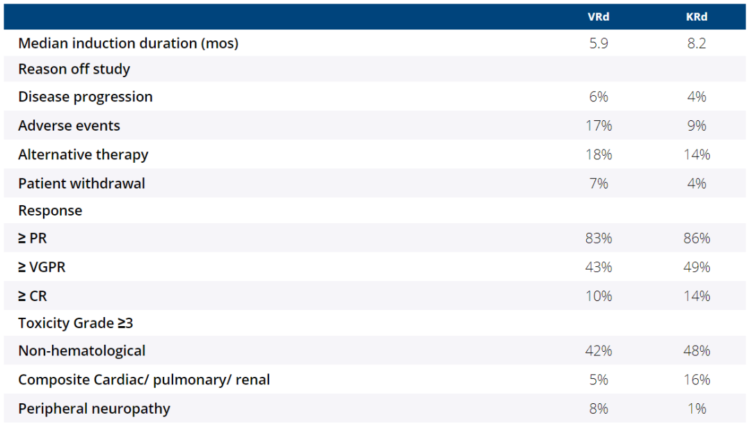 结果:研究一共入组了1087例患者(VRd=542,KRd=545)。中位年龄为65岁。治疗、疗效和毒性数据见下表。在3个计划中期分析中的第二个分析中,PFS HR=1.04(95%CI,0.8-1.3,P=0.74),无显著差异。VRd组和KRd组患者中位PFS分别为34.4个月和34.6个月,年龄(<65岁或≥65岁)、有无t(4;14)或ISS分期等亚组均无差异。三年OS(95%CI)相似,VRd组和KRd组患者分别为84%(80-88)和86%(82-89)。