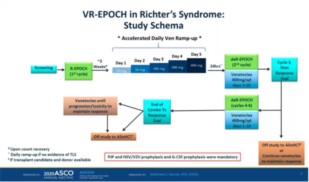 近期有研究发现,Bcl-2抑制剂Venetoclax(Ven)单药治疗Richter’s转化患者的ORR达43%。因此,研究者进一步计划在美国三个中心继续开展Ven联合剂量调整的R-EPOCH用于治疗Richter’s转化患者的多中心II期临床研究。该研究方案的具体用药方案为:第1周期仅给予1疗程剂量调整的R-EPOCH方案。待患者血象完全恢复后,进行Ven剂量爬坡试验(按照20/50/100/200/400 mg 每日1次,如无明显毒副作用,则剂量逐渐递增至400mg后维持)。后续第2-6疗程同时给予Ven+R-EPOCH方案,其中Ven 400 mg每日1次, 第1-10天,每周期21天。对VREPOCH方案有效的患者,后续可进行异基因造血干细胞移植(alloHCT);如不符合移植条件或无合适供者,则可采用Ven单药维持治疗,剂量为400mg/天。该研究采用Lugano标准进行后续疗效评估。