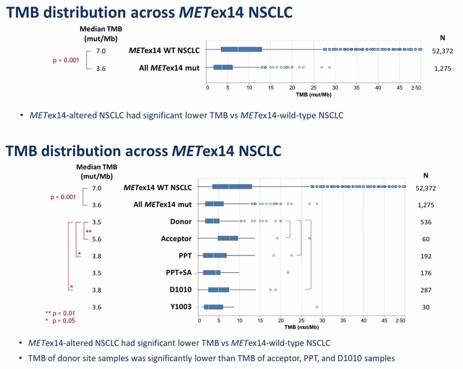 然而,MET 14外显子跳跃突变NSCLC的PD-L1高表达(≥50%)比例高于野生型,分别为48% vs. 29%(p=5.5E-19),PD-L1阳性率在MET 14外显子突变的各功能位点亚组的分布情况相似。在所有MET 14外显子跳跃突变NSCLC病例中,TMB和PD-L1表达没有相关性(P=0.76)。