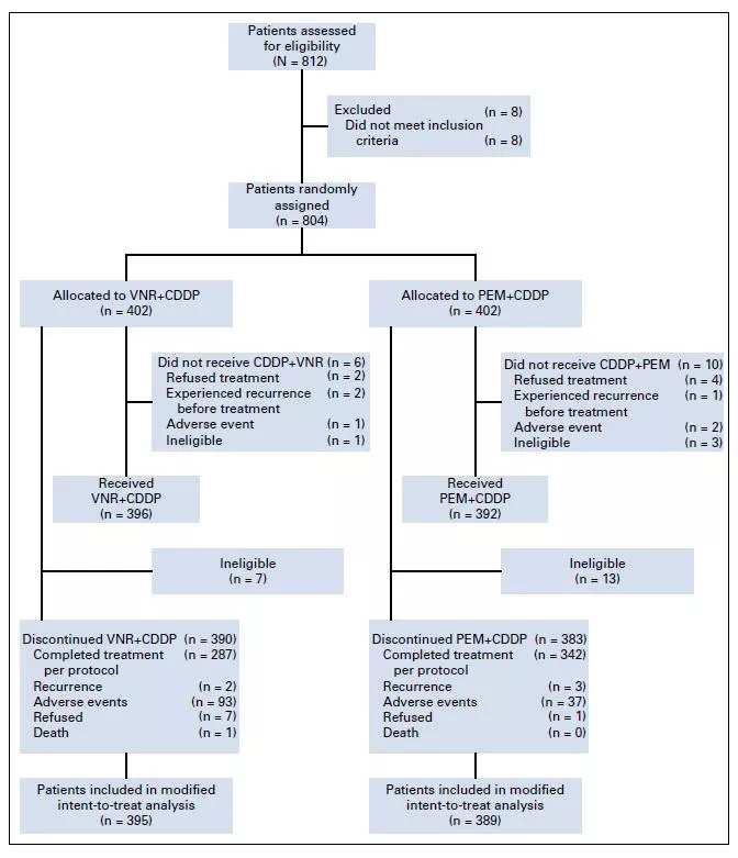 从2012年3月至2016年8月,共计804例患者接受筛选并入组本研究。长春瑞滨组和培美曲塞组各有402例患者,其中长春瑞滨组和培美曲塞组分别有6例和10例患者因各种原因未接受术后辅助化疗(图1)。