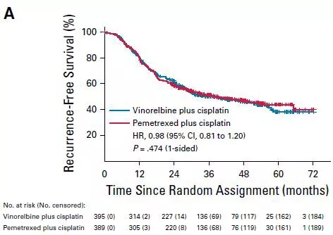 中位随访时间为45.2个月,全组有53%的患者出现疾病复发或死亡。长春瑞滨组和培美曲塞组的RFS分别为37.3个月和38.9个月,差异无统计学意义(HR=0.98, 95% CI: 0.81-1.20; P=0.474)。2年无复发生存率分别为60.7%和58.3%,3年无复发生存率分别为50.2%和51.1%(图3)。
