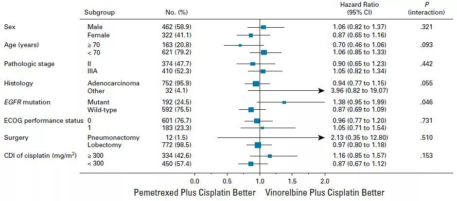 亚组分析发现,野生型患者接受培美曲塞显示出了更好的获益趋势,但差异无统计学意义。而携带EGFR基因突变的患者接受长春瑞滨治疗,显示了更好的获益趋势,但差异同样无统计学意义(图4)。