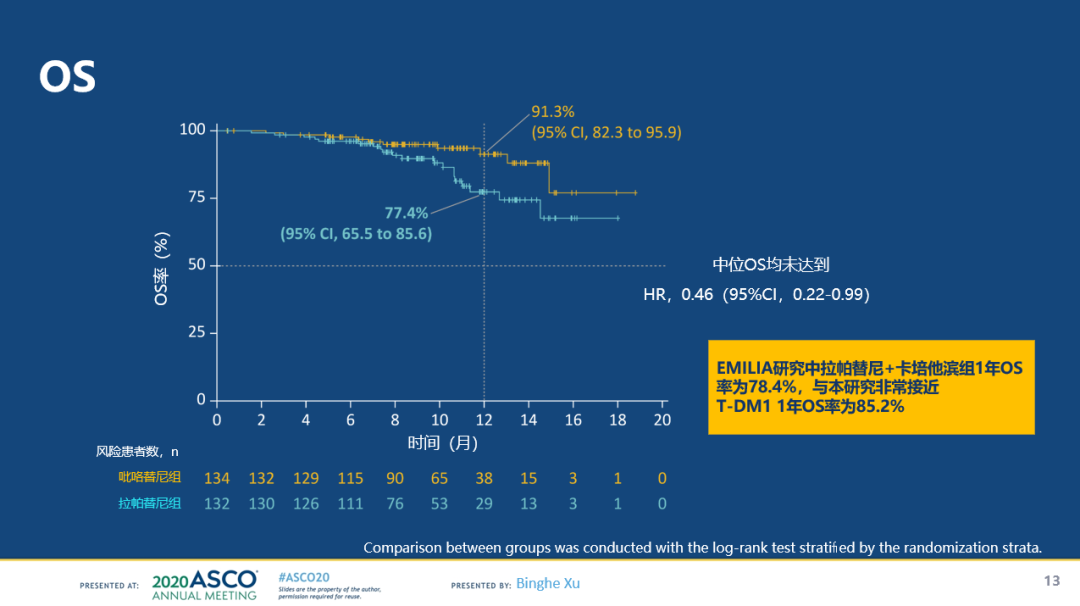 研究发现不论曲妥珠单抗是否耐药,患者从吡咯替尼联合卡培他滨的治疗中均能获益(耐药组HR=0.60,非耐药组HR=0.33),这也提示曲妥珠单抗复发/进展后更换不同作用机制抗HER2药物的重要性,同类TKI中建议选择作用机制更优的药物。从OS上来说,PHOEBE与EMILIA研究对照组1年OS率也是相似的(77.4% vs. 78.4%),提示吡咯替尼组1年OS率可能优于T-DM1(91.3% vs. 85.2%)。