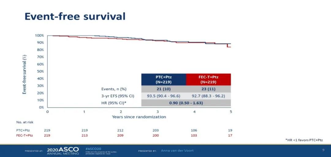 TRAIN-2研究旨在探索HER2阳性乳腺癌新辅助化疗含或不含蒽环方案的疗效和安全性。2018年已报道,FEC-T+Ptz与PTC+Ptz组的pCR率均较高(68% vs. 67%),本次3年随访结果显示,对于初诊有一定肿瘤负荷的HER2阳性乳腺癌,含蒽环方案的EFS和OS均无显著差异,研究提示对于HER2阳性的患者主要依赖HER2信号通路,因此在足够的抗HER2治疗下,并不一定要用蒽环。
