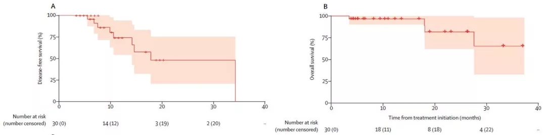 中位随访12.9个月后,30%的患者出现疾病复发,7%的患者疑似疾病复发,已经出现复发的患者中,4例为脑复发,3例患者已经死亡,整体人群的DFS为17.9个月,OS尚未达到(图3)。