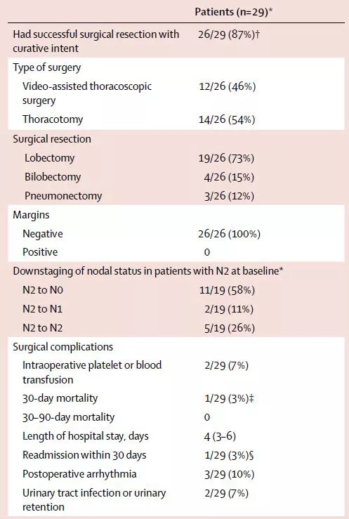 从2016年5月到2019年3月,共计39例患者符合入组标准,30例患者入组,57%为腺癌,40%为鳞癌,3%为大细胞神经内分泌癌,55%的患者PD-L1表达≥1%,27%的患者≥50%,77%的患者为IIIa期。所有患者中,97%的患者接受了手术,其中87%为R0切除。没有因不良反应而导致手术延迟的患者。末次治疗结束至手术开始的中位时间为26.5天(图1)。
