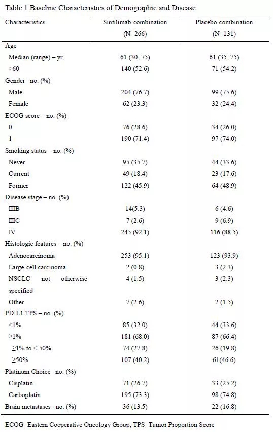 从2018年4月至2019年7月,共计862例患者接受筛查,397例患者入组并接受随机化。信迪利单抗组和安慰剂组分别入组266例和131例患者。两组患者基线特点均衡可比(图1)。