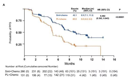 数据截止时(2019年11月15日),全组中位随访时间为8.9个月,信迪利单抗组和安慰剂组分别有85.3%和80.2%的患者完成了4周期诱导治疗。两组接受维持治疗的周期数分别为7周期和4周期。信迪利单抗组和安慰剂组分别有56.8%和35.1%的患者在数据分析时仍然接受原来的治疗。中位治疗持续时间分别为7.1个月和5.5个月,安慰剂组有31.3%的患者疾病进展后交叉接受信迪利单抗治疗,4.6%的患者接受其他免疫检查点抑制剂的治疗。数据分析时,信迪利单抗组和安慰剂组分别有42.1%和65.6%的患者经独立评审委员会评估出现疾病进展事件,中位PFS分别为8.9个月和5.0个月(HR=0.482),6个月PFS率分别为68.3%和42%(图2)。