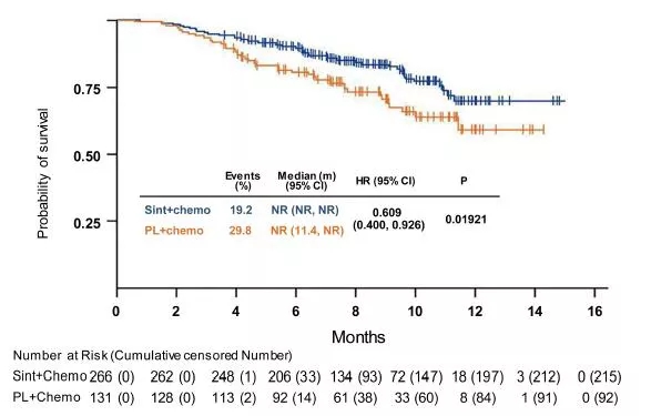 两组分别有19.2%和29.8%的患者出现死亡事件,中位OS尚未达到,但信迪利单抗组已经显现出了有OS获益的趋势(图4)。