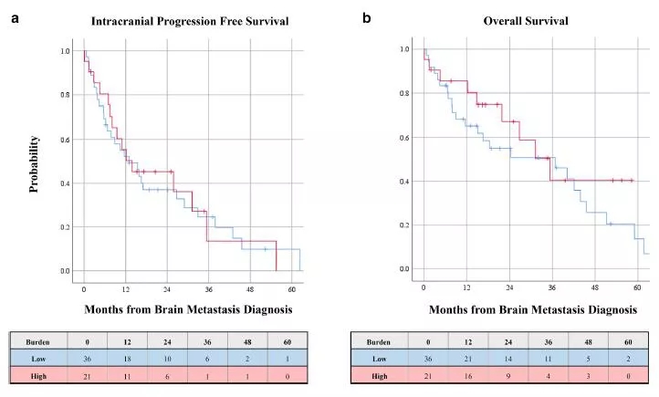 这是一项回顾性研究,携带EGFR或ALK融合的晚期NSCLC患者分别入组49例和8例患者。高颅内肿瘤负荷定义为颅内转移灶≥10个、转移灶体积>15cc或肿瘤最大直径超过3cm。研究基于RANO标准进行疗效评估。全组患者自脑转移开始的中位随访时间为17个月,54%的患者有中枢神经系统症状。