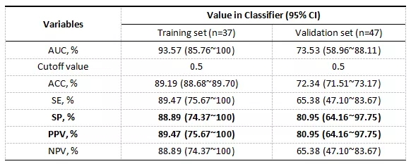 基于前期差异分析的结果,研究人员构建了以特征细菌作为预测变量的随机森林分类器(图5)。在由19例优效患者和18例劣效患者组成的训练集中,模型的曲线下面积达94%,在26例优效患者和21例劣效患者组成的验证集中,模型的曲线下面积达74%。下表总结了模型在cut off值为0.5时的分类器的预测表现(表1),可见训练集和验证集中特异度和阳性预测值均达到80%以上。提示该模型对于TRG 0~1分的优效患者的预测效果较好。