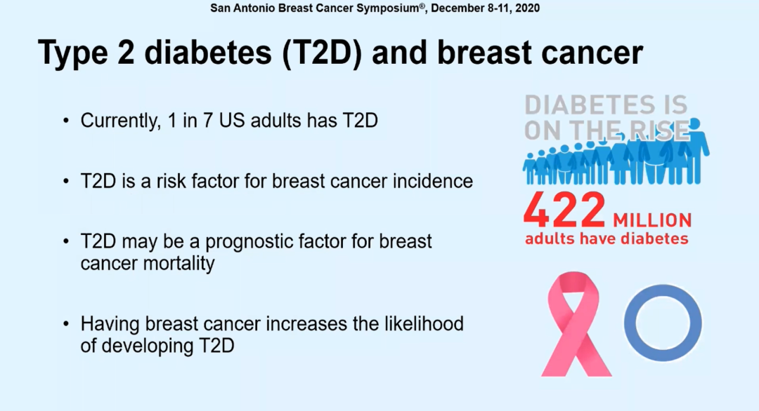 编者按:近些年来,随着生活水平的提高,肥胖症、糖尿病、心脑血管疾病以及肿瘤的发病率持续升高,人们越来越关注饮食和疾病之间的关系。糖代谢在乳腺癌发生发展的不同阶段扮演着的角色也值得进一步探索。今年的SABCS大会上两项临床研究探讨了相关问题,《肿瘤瞭望》特邀河南省肿瘤医院闫敏教授进行介绍,具体如下。