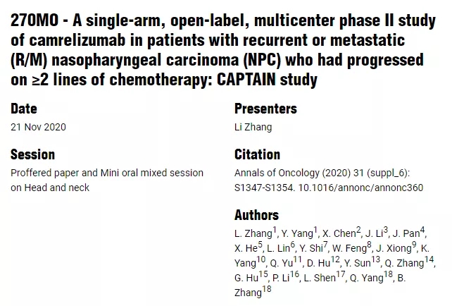 270MO-一项关于卡瑞利珠单抗治疗既往接受2线及以上化疗方案后复发或转移(R/M)的鼻咽癌的单臂、开放、多中心的Ⅱ期临床研究:CAPTAIN研究