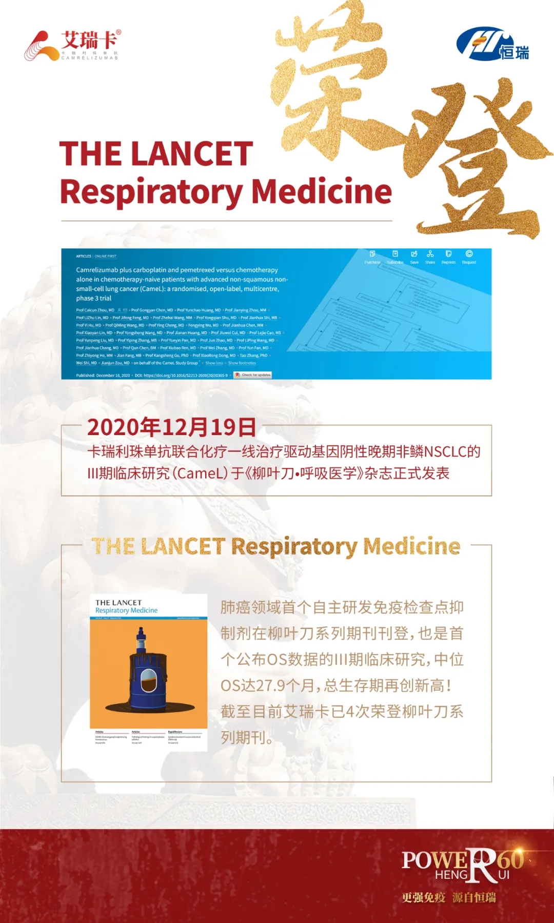 12月19日,全球顶尖学术期刊《柳叶刀-呼吸医学》(THE LANCET Respiratory Medicine)全文在线发表“卡瑞利珠单抗联合卡铂和培美曲塞对比单纯化疗一线治疗晚期非鳞非小细胞肺癌的随机、开放、多中心、Ⅲ期临床试验(CameL研究)”的研究成果。