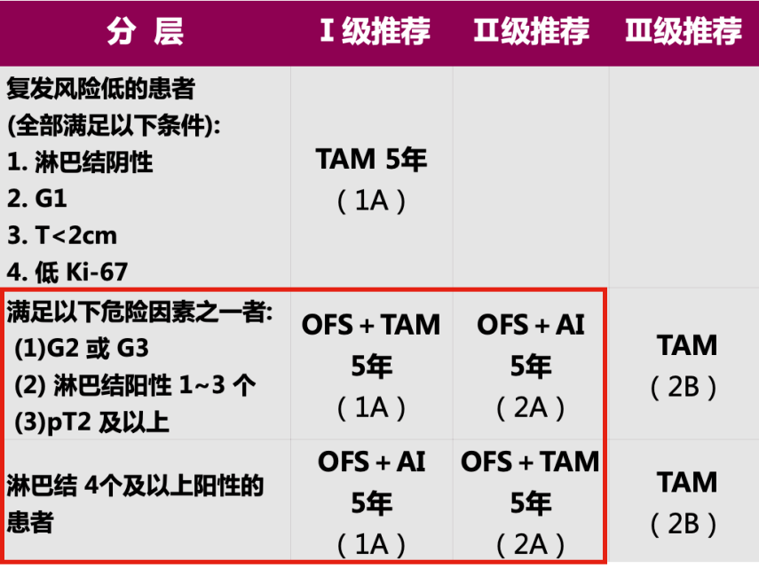 《中国临床肿瘤学会(CSCO)乳腺癌诊疗指南》9对绝经前激素受体阳性乳腺癌患者的治疗选择进行了分层,对于早期乳腺癌患者的初始内分泌治疗作出如下推荐: