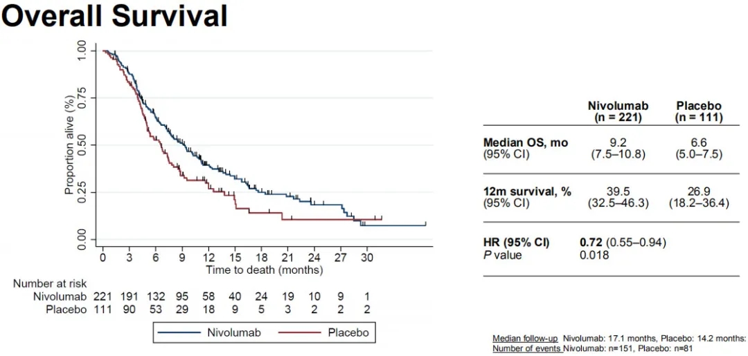 ? 两个生存终点均实现:纳武利尤单抗治疗增加了OS获益,中位OS分别为9.2个月(95% CI: 7.5-10.8) vs. 6.6个月(95% CI: 5.0-7.5) (HR=0.72;95%CI:0.55-0.94;P=0.018)。纳武利尤单抗组的12个月OS率为39.5%,安慰剂组为26.9%;但由于事件数目前尚未达到,OS数据还不成熟。