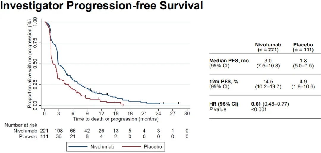 PFS数据也显示纳武利尤单抗组显著优于安慰剂组,分别为3.0个月 vs. 1.8个月(HR=0.61; 95% CI: 0.48-0.77;P<0.001),两组的12个月PFS率分别为14.5% vs. 4.9%。
