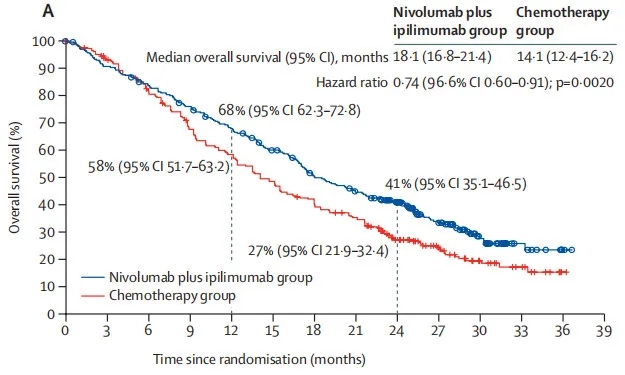 CheckMate-743达到了预设主要终点OS。以下介绍刊登于《柳叶刀》的中位随访29.7个月的研究数据。