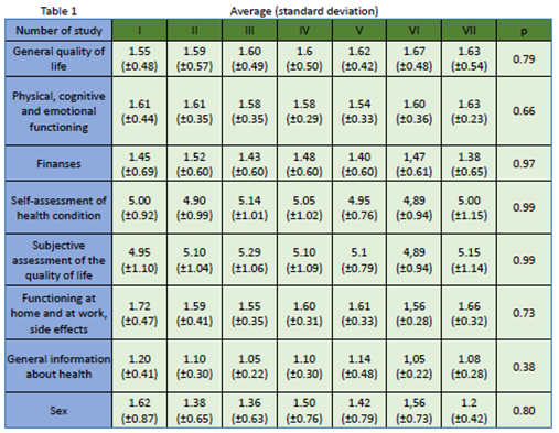 研究结果显示:21名患者,年龄40 - 78岁(59.3 ±11.5岁),13例患者(62%)为女性,8例患者(38%)为男性。如表1所示,尽管调查对象在随访期间QoL存在差异,但在统计学上差异不显著p>0.05。性别之间的统计关系:一般生活质量:女性-1.72 (± 0.51),男性1.28 (± 0.24),p=0.03。自我评估的健康状况因素,女性-4.67 (± 0.98),男性-5.50 (± 0.53) ,p=0.04。在家和工作时的功能状态女性-1.90(± 0.48), 男性-1.38 (± 0.16), p=0.01,见图1、2、3。结论表明,在随访期,即平均8 - 9个月治疗和接下来的9个月观察期,在一般生活质量、自我评估健康状态、在家和工作时的功能状态,不同性别间有显著性差异。已开展的研究未发现新的安全性信号或生活质量恶化。