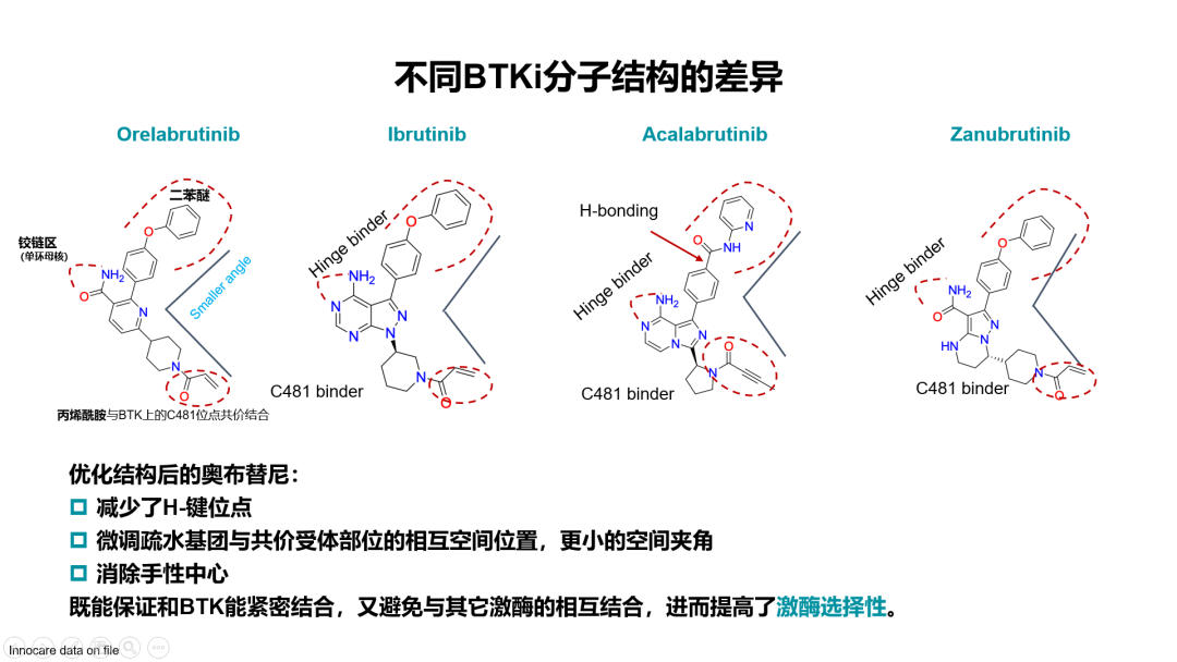 王潇潇教授:奥布替尼与其他已经上市的BTK抑制剂相比,在分子结构上有以下不同:第一,单环母核结构,减少H键位点;第二,调整药物疏水基团与共价受体部位的相互空间位置,形成更小的空间夹角;第三,消除手性中心,减少空间构象。