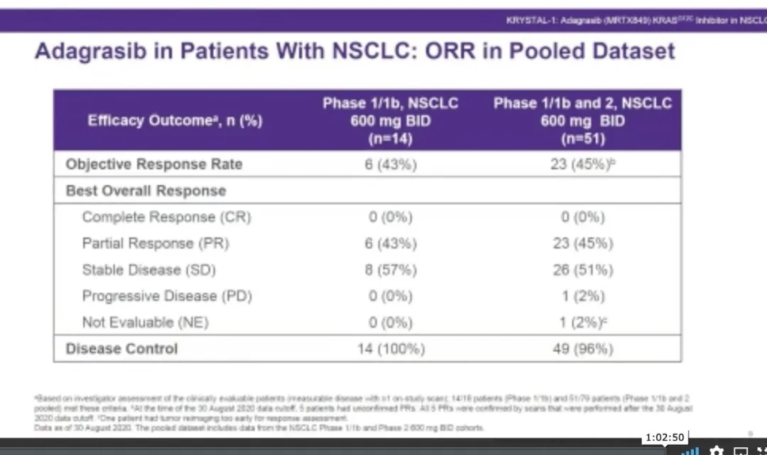 adagasib (MRTX849)在KRAS g12c突变的晚期非小细胞肺癌(NSCLC)患者中产生了持久的应答和广泛的疾病控制。