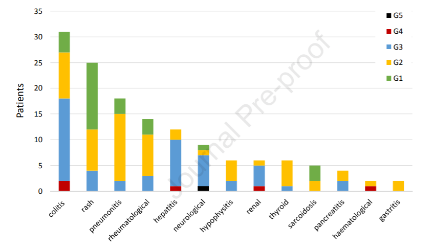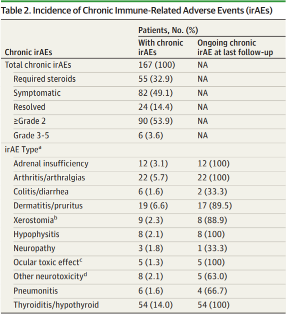 • 内分泌疾病(73/88;83.0%)、关节炎(22/45;48.9%)、口干(17例中的9例;52.9%)、神经毒性(11/15;73.3%)和眼部事件(5/8;62.5%)最有可能成为慢性irAE。
