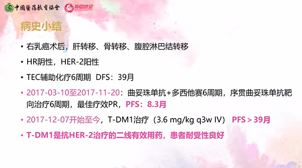 哈尔滨医科大学附属肿瘤医院张悦和李丽茹教授共同介绍了一例右乳癌术后多处复发转移的HR-/HER2+乳腺癌患者治疗的病例,该患者经TEC辅助化疗6周后,DFS为39个月。患者的晚期一线治疗入组了PUFFIN研究,接受曲妥珠单抗+多西他赛6周期,序贯曲妥珠单抗6周期,后因PD出组,一线治疗PFS为8.3个月。一线进展后从2017年2月至今,患者一直接受T-DM1治疗,PFS>39个月,患者用药期间未出现其他血液学毒性,耐受性良好。