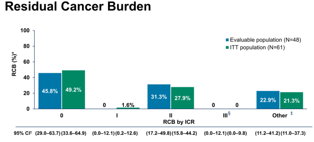 可评估人群和ITT人群的pCR和RCB如下图所示。可评估人群pCR by ICR vs ITT人群pCR by ICR:22(45.8%) 95%CI:32.0~60.6 vs 30(49.2) 95%CI:36.7~61.6。