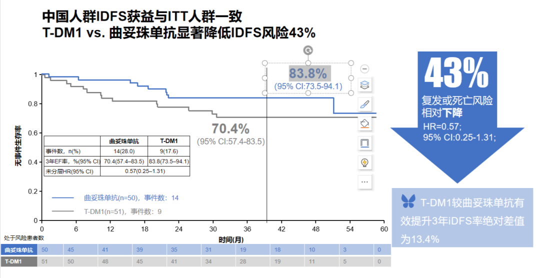 但早期HER2阳性乳腺癌患者经PH双靶新辅助治疗后,仍有约30%~60%的患者被评估为有残留病灶(non-pCR)。对于这部分患者的后续治疗,KATHERINE研究进行了探索,中位随访41个月,T-DM1组3年iDFS率为88.3%,曲妥珠单抗组为77.0%,两组绝对差异达11.3%。ITT人群疾病复发或死亡风险显著降低50%。而中国人群iDFS获益与ITT人群一致(83.8% vs. 70.4%),T-DM1组较曲妥珠单抗组3年iDFS率绝对差值为13.4%。T-DM1组疾病复发、死亡风险较曲妥珠单抗组降低43%,与全球ITT人群获益类似。