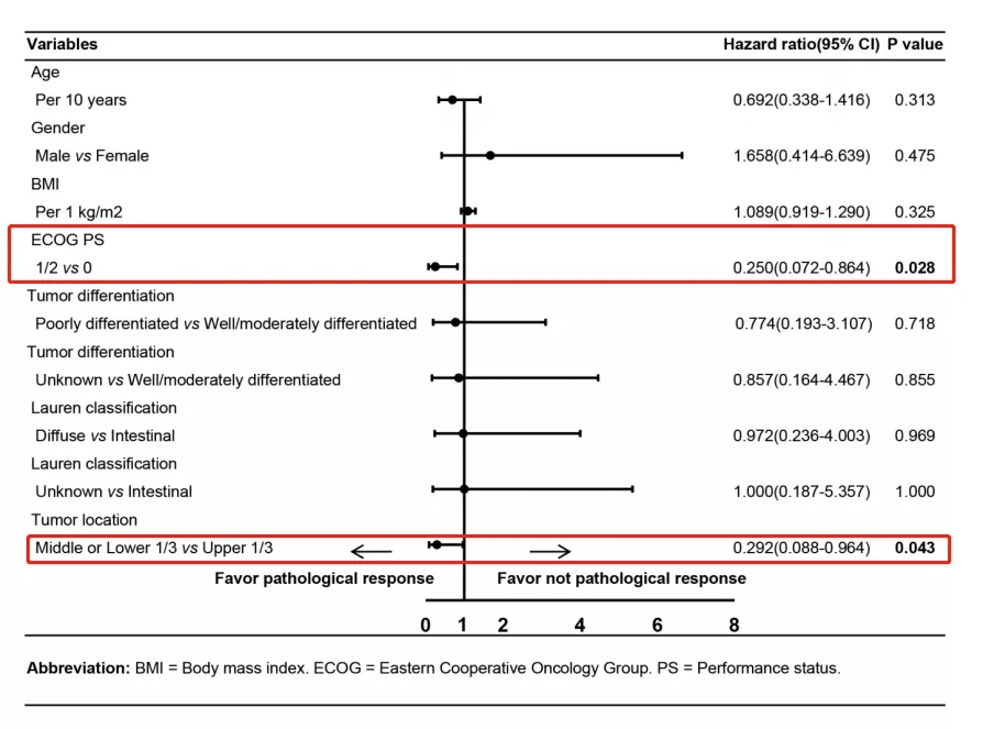 图2. Logistic回归模型中不同基线特征患者的病理缓解情况