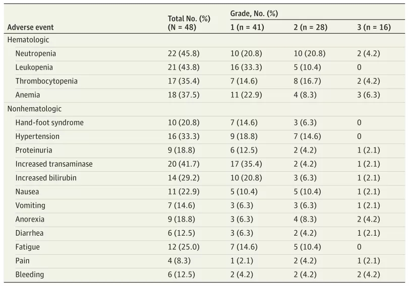 高血压、手足综合征和蛋白尿是抗血管生成药物中最常见的不良反应。而在本研究中,阿帕替尼加SOX最常见的AEs为中性粒细胞减少(45.8%)、白细胞减少(43.8%)、转氨酶升高(41.7%)和贫血(37.5%)。这些数据表明,阿帕替尼联合SOX的毒性作用主要是SOX相关的毒性作用。因此,目前的研究结果支持阿帕替尼加化疗的良好耐受性。