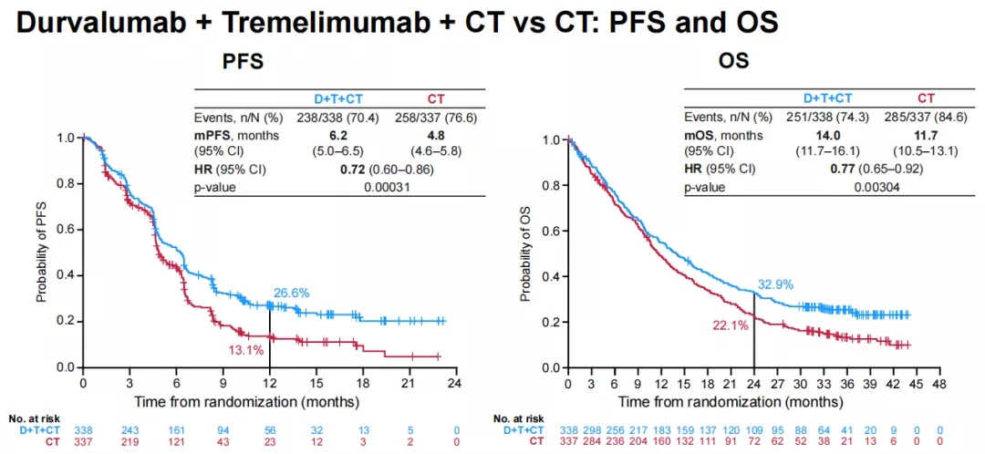 联合方案再加入Tremelimumab后,生存获益愈加明显,1年PFS率增加至26.6%,2年OS率为32.9%。因此,D+T+CT的联合治疗可能会成为极具前景的转移性非小细胞肺癌的一线治疗方案。